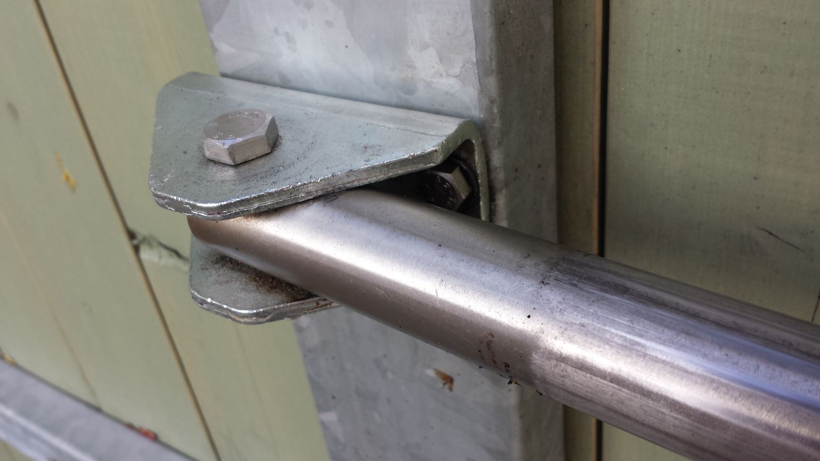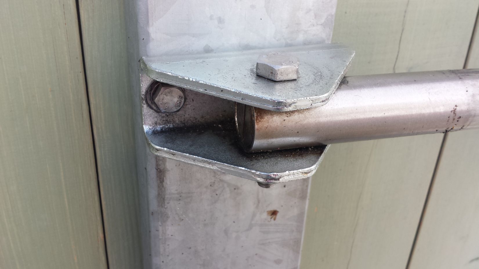 1. Die Schraube komplett durch das Hoftor. Von außen eine Schlosserschraube durch und von hinten eine Mutter drauf.