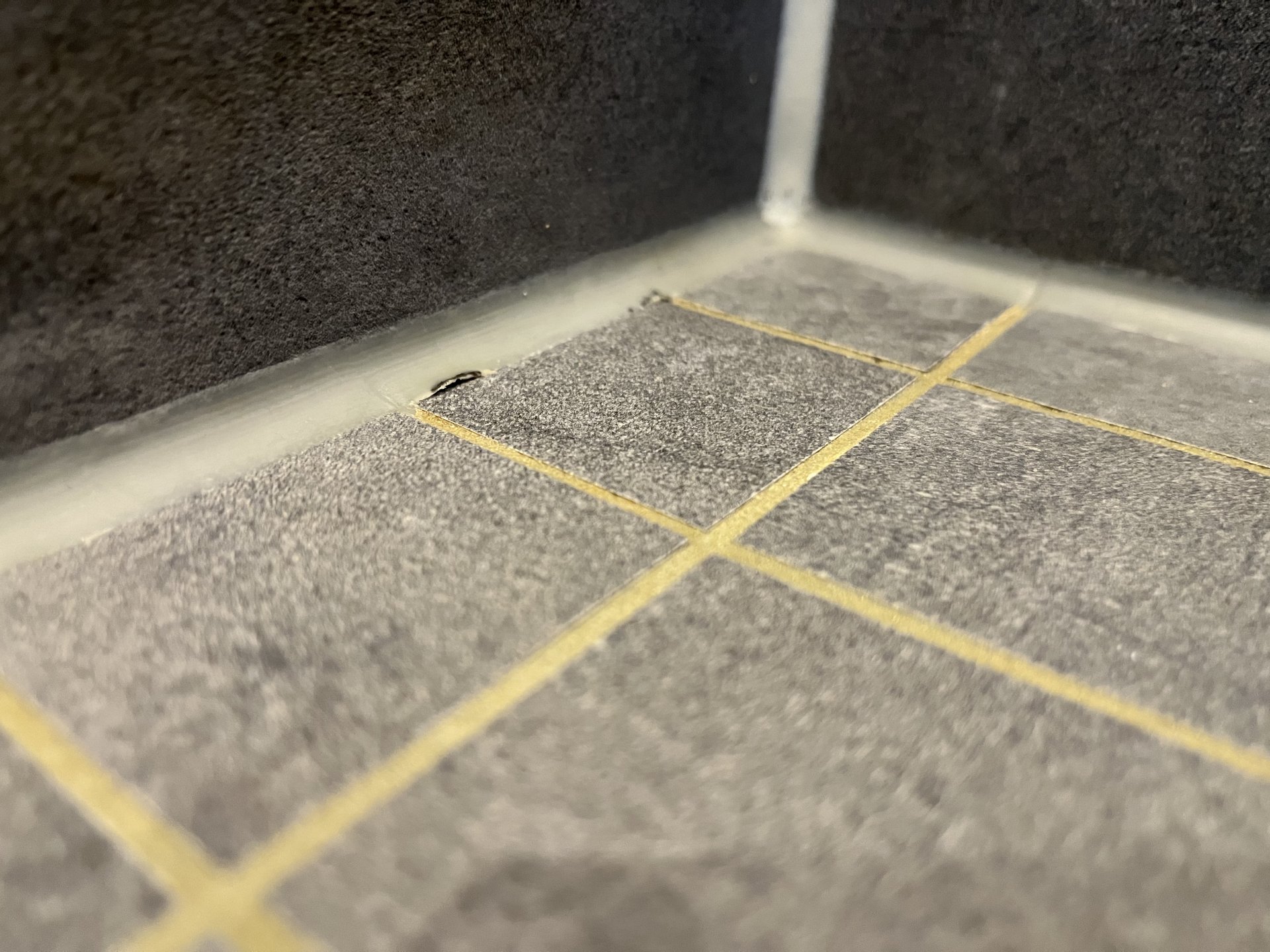 Ausblühungen auf dunkler Fuge - was ist denn hier passiert?: Hallo! Vor drei Tagen wurde unsere Dusche nach einem Mangel bzgl. des Aufbaus erneut gefliest. Die FLiese ist V&B Pro Architectura Feinsteinzeug...