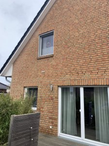 Bitte mach mal im DG eines der Fenster auf und fotografiere mal das äußere untere Fensterleibungseck, also den Anschluss zwischen Rollschicht der Fensterbank und der äußeren Fensterleibung.