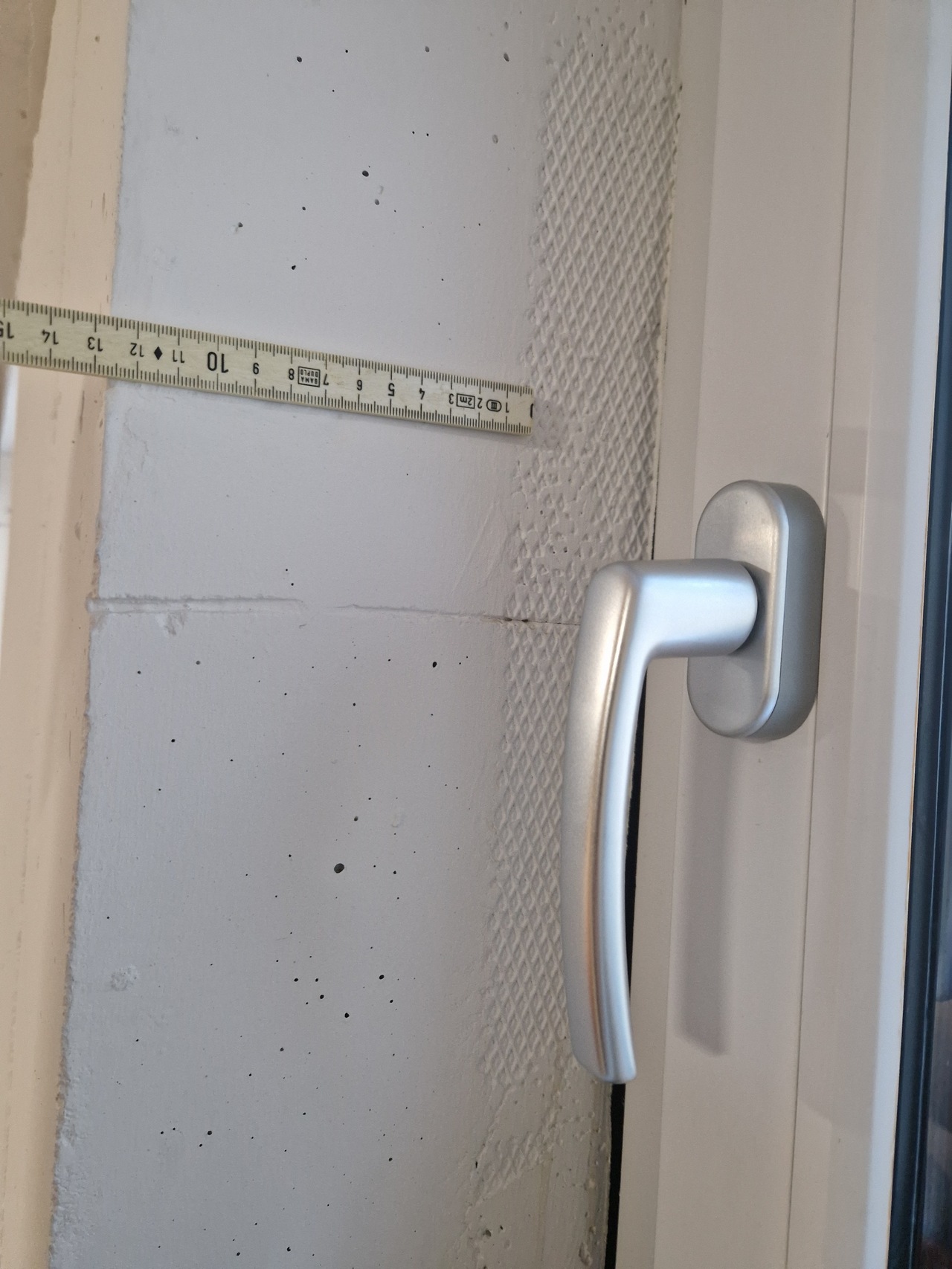 Ich möchte daher wasserdichte Fenster verbauen lassen. In unserem Fall gibt es aber Probleme, weil auch die Fenster-Laibung gedämmt wurde. Die Laibungsdämmung wurde beim Bau der weißen Wanne eingebaut. Bei einer Wu-Beton-Wandstärke von 25cm haben wir außen 12cm Dämmung und innen 13cm Beton.