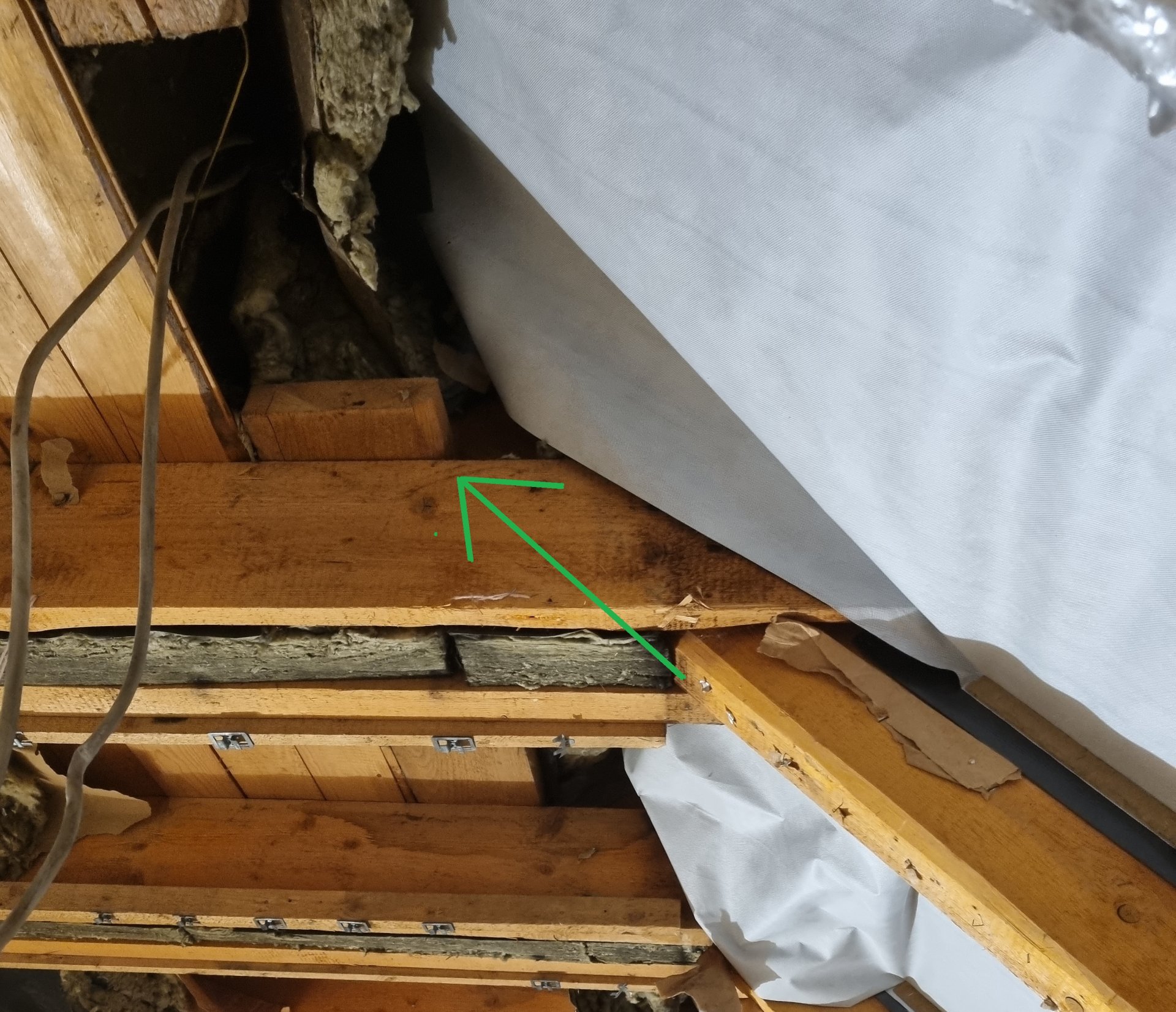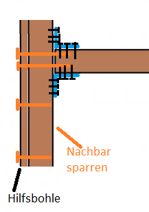 Wie bereits im vorherigen Post geschrieben, habe ich überlegt eine Bohle als Sparrenverstärkung auf der Außenseite des Wechsels anzulaschen (siehe nächstes Bild). Diese würden die Sparren von oben bis unten verstärken. Ich sehe bei der Lösung mit dem Hilfsparren immernoch eine Überlastung des benachbarten Sparren am unteren Wechsel, denn die Kraft/das Moment geht nicht wieder 1:1 in den "alten" Sparren zurück und belasten damit die benachbarten Sparren. Wäre die angelaschte Bohle eine Alternative zum Hilfssparren?