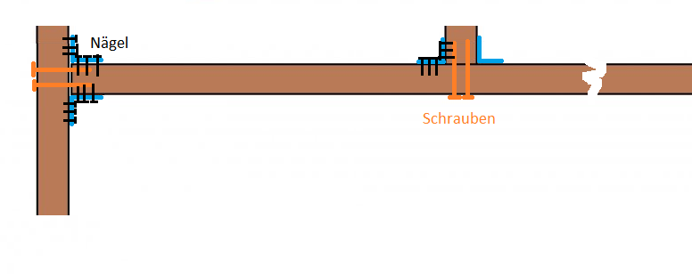Alle Balken fixiert er Stirnseitig mit Tellerkopfschrauben und montiert anschließend an allen Stößen Winkel mit Ankernägeln.