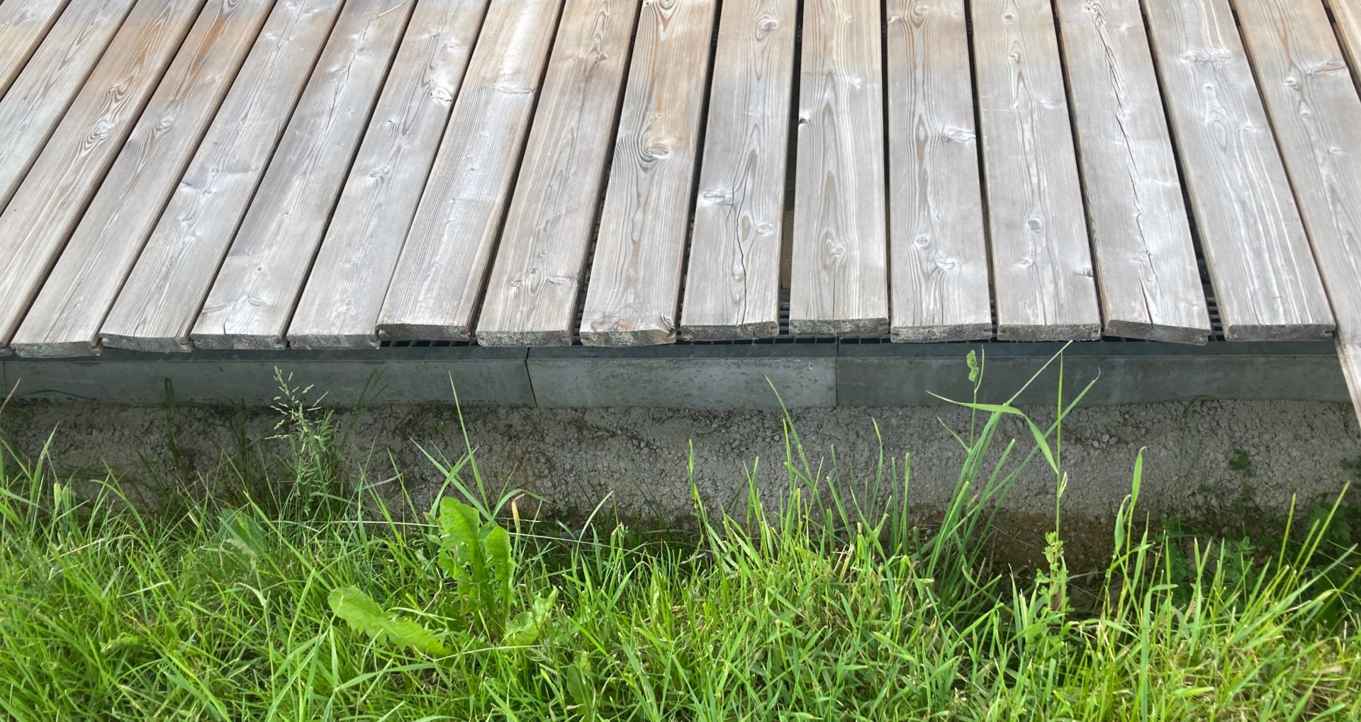 Der Überstand über das letzte Terrassenlager ist viel zu groß. Entweder beim letzten Lagerholz ablängen und dann eine Kante aus Holz machen (oder mit Boardsteinen, wie auch immer), oder die Terrasse weiter hinaus ziehen. Also ein weiteres Lager stellen, so dass das Holz bis zum Hügel reicht. Also quasi neues Holz kaufen.
