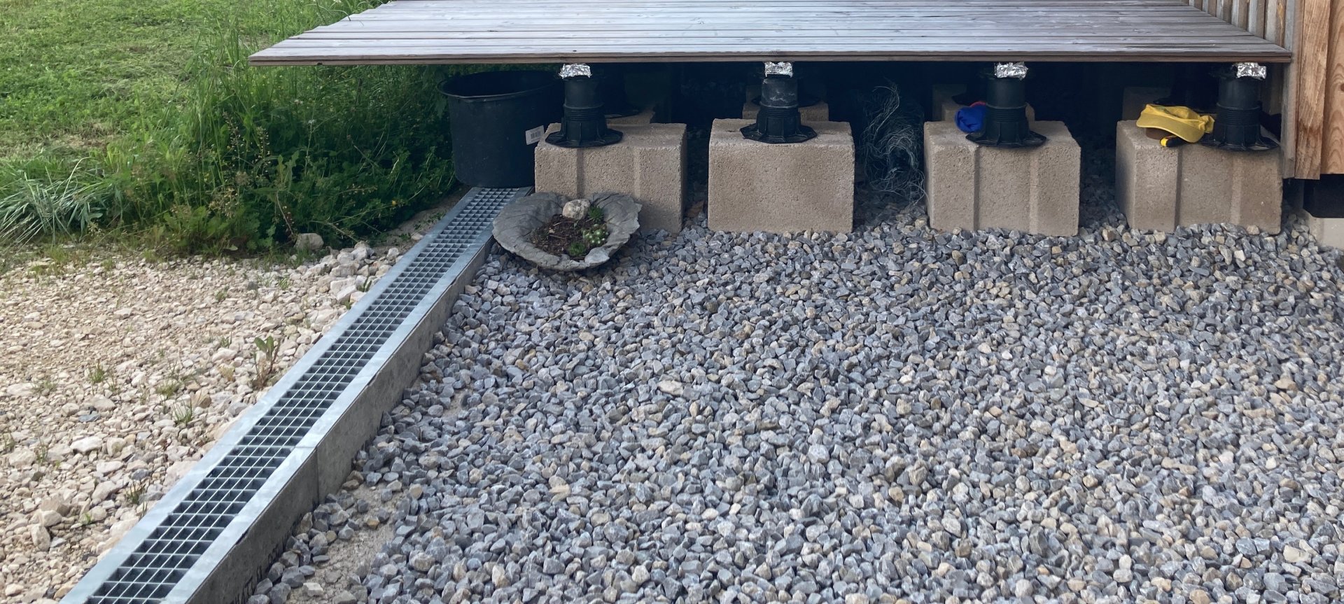 Da fehlt mir noch eine Regenrinne unmittelbar an der Hauswand, die das Wasser von der Oberfläche des Bodens aufnehmen und ableiten kann. Also mit einem Gitter und einer Möglichkeit sie hin und wieder zu reinigen.