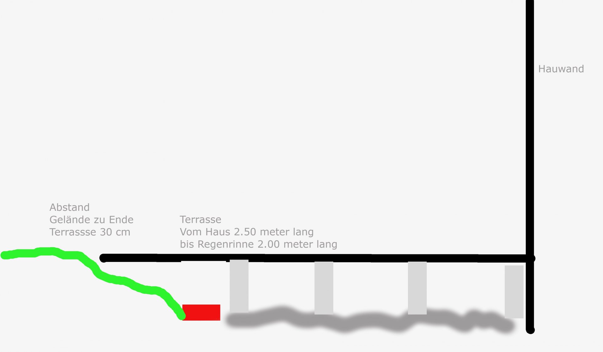 voller Stolz haben wir nun endlich unsere Terrasse beendet. Soweit so gut. Nur leider fehlen uns an einigen Stellen zwischen Terrasse und Garten 20 bis 30 cm, wo das Geländer abfällt. Erst dachten wir, ach so schlimm wird das nicht, aber leider ist es doch eine größere Stolperfalle. Ich habe mal das ganze skizziert.