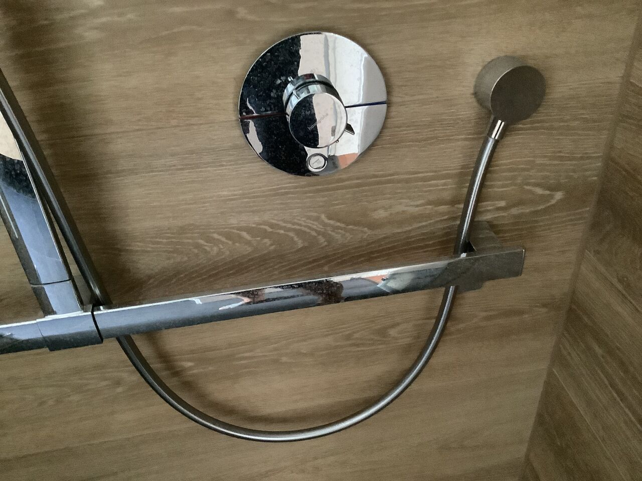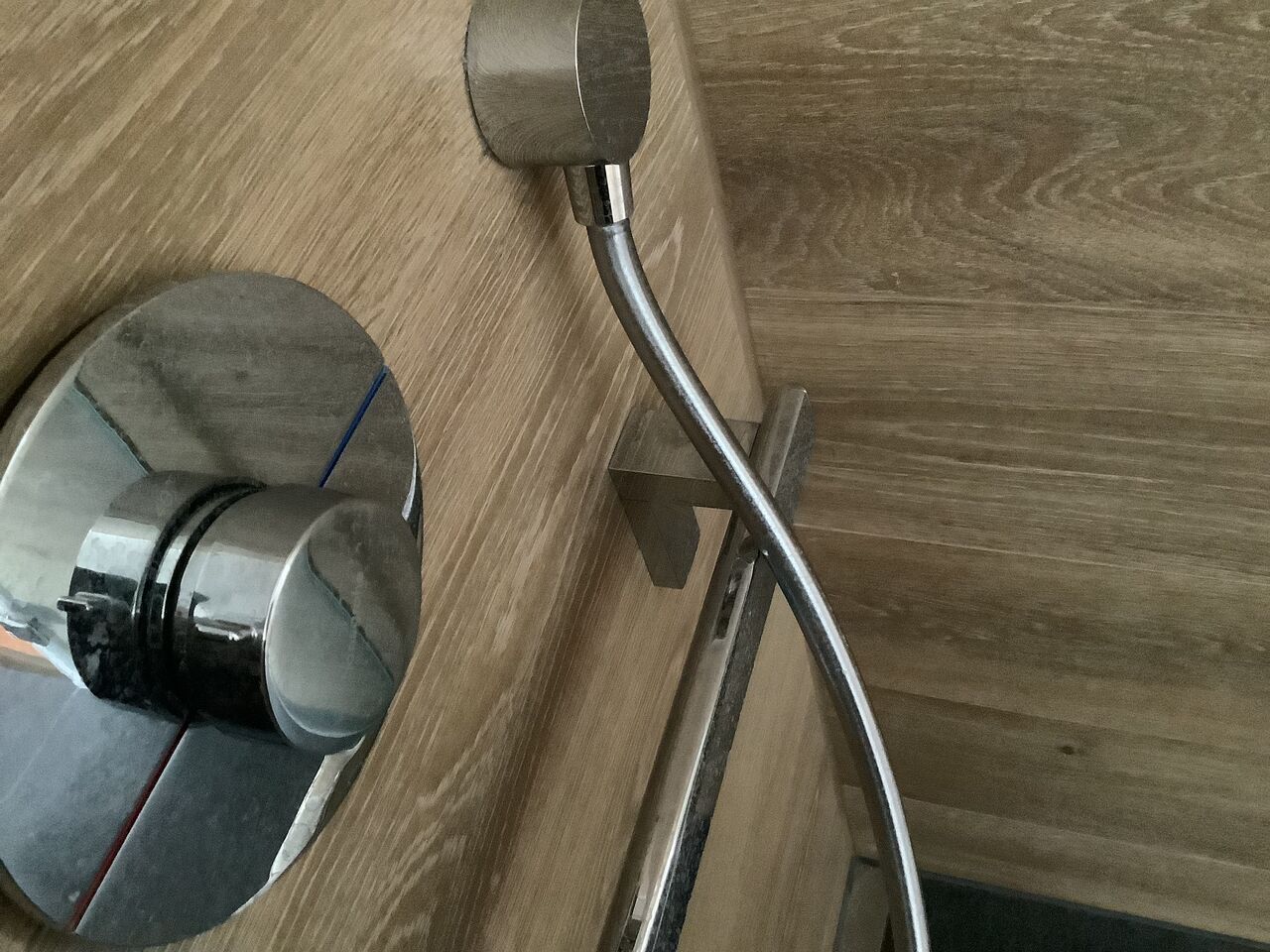 - der Schlauch ist in der Dusche so angebracht, dass er immer mit dem Haltegriff kollidiert, v.a. wenn ich ihn in der Hand halte beim Duschen