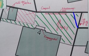 ich will demnächst meinen Hof (ca. 150qm) pflastern. Auf dem Bild soll die Grün schraffierte Fläche inkl. Rot schraffierte Fläche unter dem Carport gepflastert werden. Geplant war das Gefälle vom Haus weg zu führen und eine Entwässerungsrinne an der Mauer entlang des Nachbarn.