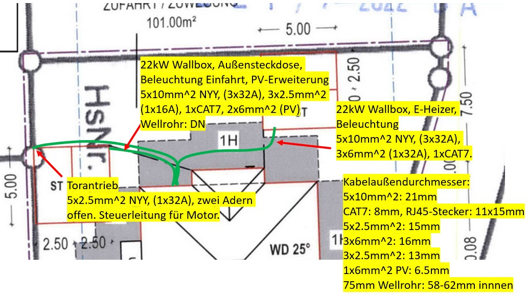 Diskutiere Zuleitungen Außenbereich bei Neubau: Garage, Carport & Torantrieb im Elektro 1 Forum im Bereich Haustechnik; Ich baue gerade ein Zweifamilienhaus und möchte folgende Stellen mit Strom versorgen: 1. Doppelgarage 6m x 9m von mir genutzt 2. Carport 6m x 6m...