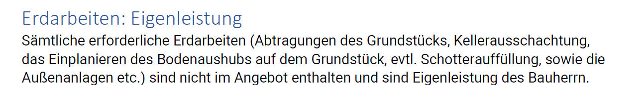 Die Eigenleistung beim Tiefbau und Elektro wurden auf unseren Wunsch hinzugefügt. Beim Tiefbau sind fachkundige Freunde vorhanden und bei Elektro sollte nur Standard eingepreist werden, da vermutlich KNX-Installation in Eigenleistung eingezogen wird und dann von einem Fachbetrieb abgenommen wird.